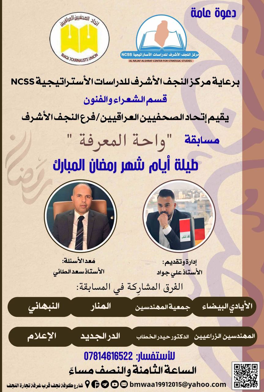 إتحاد الصحفيين العراقيين / فرع النجف الأشرف مسابقة “واحة المعرفة” طيلة أيام شهر رمضان المبارك