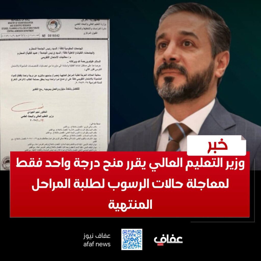 وزير التعليم العالي يقرر منح درجة واحدة فقط لمعاجلة حالات الرسوب لطلبة المراحل المنتهية